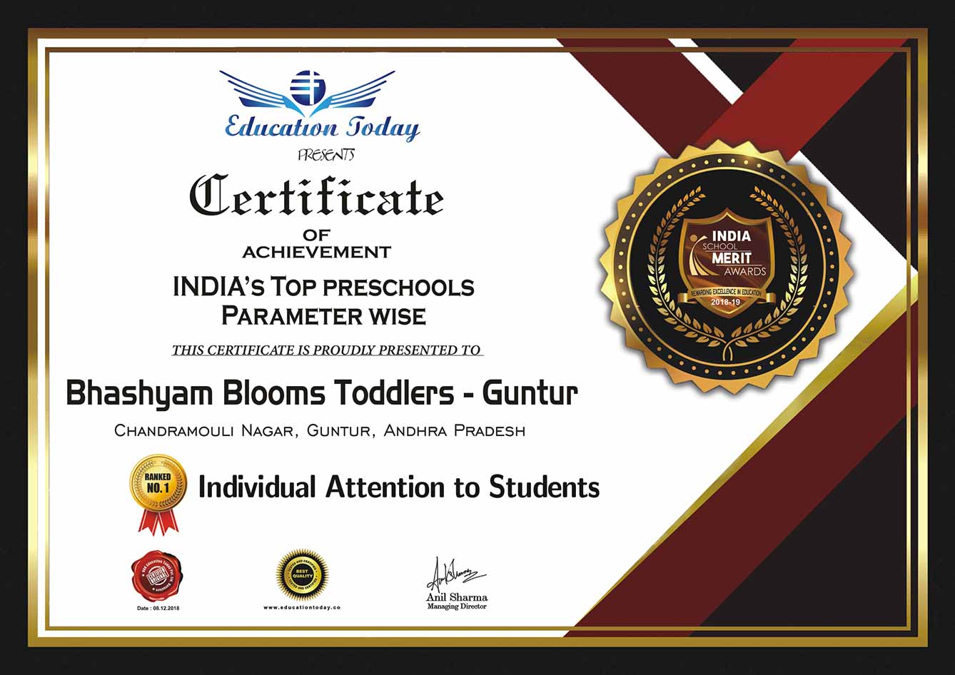 Bhashyam Blooms Brahmanapally, offers education from Nursery to VIII standard and follows CBSE pattern of education. It provides learning environment comprises the physical, social, and pedagogical context in which learning occurs.